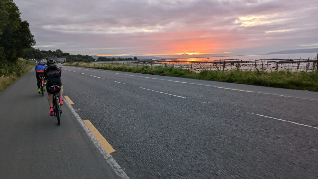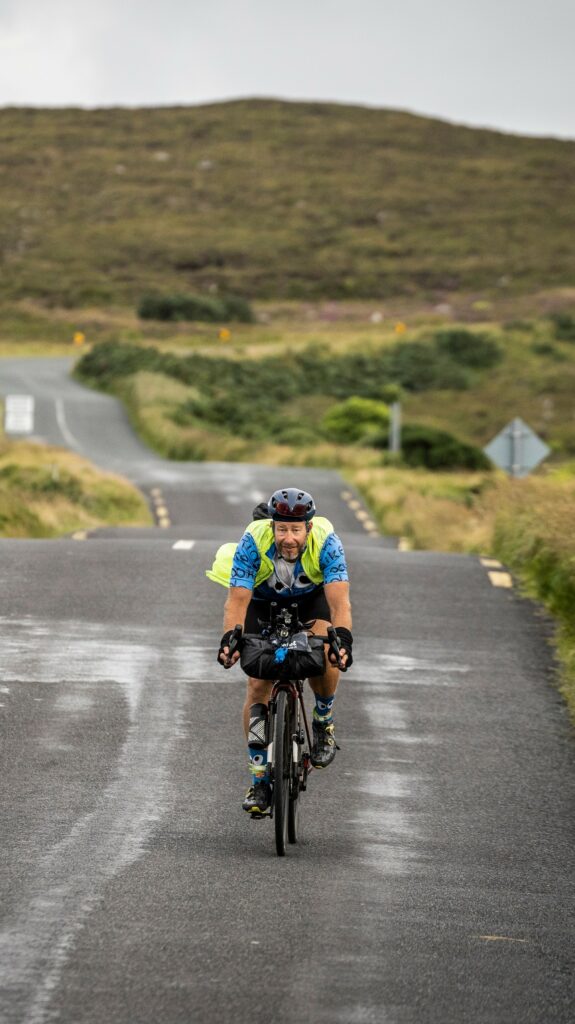 Nach dem Start in Derry in Nordirland ging es 2 100 km und 22 600 Höhenmeter entlang der irischen Küste. Gegen den Wind – nein, nicht der Wind wie wir ihn kennen, richtiger, irischer Gegenwind mit Sturmböen. Man fährt über steile Anstiege, zumeist sehr steile Anstiege. Die Strecke führt entlang schlechter Straßen – da fährst du nicht zwischen den Schlaglöchern, weil das gar nicht geht, sondern da versuchst du nur die kleinsten Schlaglöcher zu treffen. Oft radelt man zwischen Schafen und deren Exkrementen – und manchmal kann einem auch ein Stier entgegenkommen – ja, so ist es mir tatsächlich passiert.