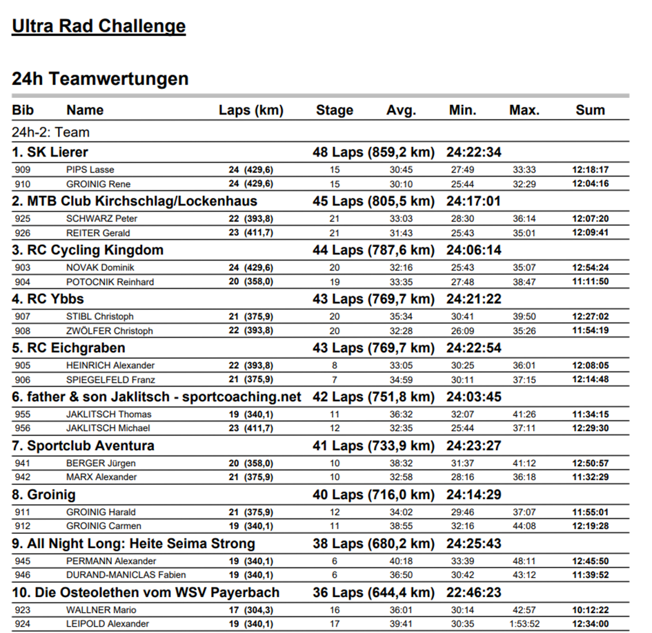 Am Ende der 24 Stunden hatten unsere beiden Athleten der hervorragenden 4. Platz erreicht. Es waren in Summe 25 2er-Teams am Start.
